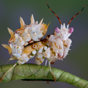 The spiny flower mantis comes in a variety of colors: white (as pictured above), green, purple, pink, red, and yellow. They also have “eyes” on their wings that they use to scare away larger predators, that have many different colors as well: black, white/cream, and green mixtures. Spiny flower mantises hunt by mimicking flowers, lying in wait on actual flowers till would-be prey passes by.